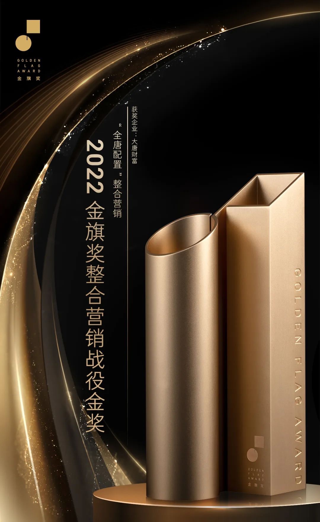 金旗奖创办于2010年,由中国公共关系行业平台主办,经过多年发展,金旗奖已经成为公关传播领 域最具专业性和认可度的品牌影响力大奖,被誉为“中国公关行业年度奥斯卡”。大唐财富“全唐配 置整合营销”从众多参选案例中突出重围,被评选为2022金旗奖“整合营销战役金奖”。与腾讯 科技、小红书等知名企业共同获奖。