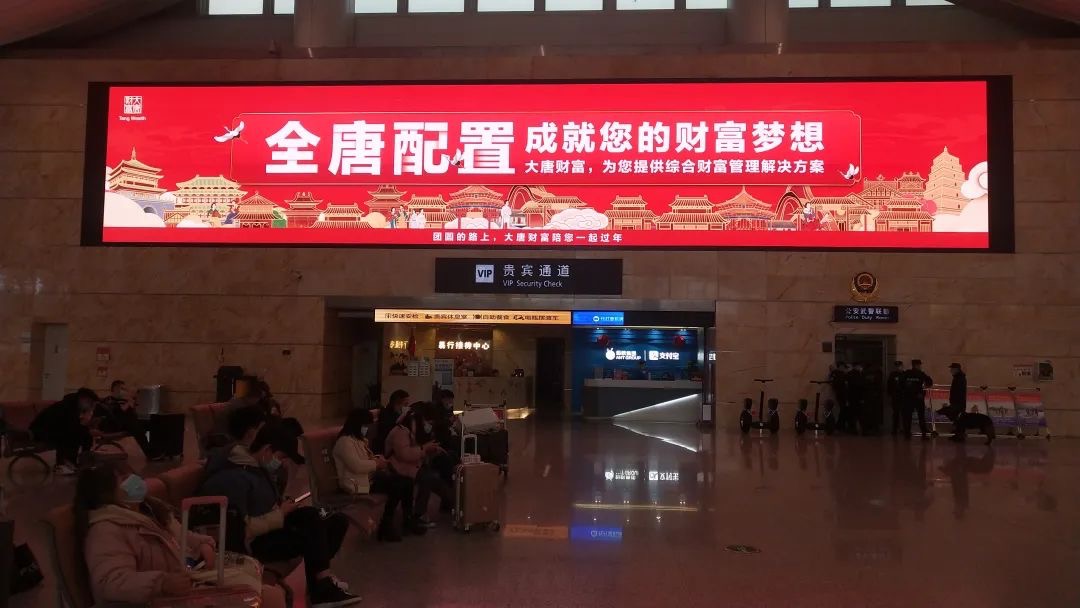 同时,在2022年春节期间,大唐财富在微信朋友圈、机场通道、城市地标等进行“海陆空”立体式广 告投放,将“全唐配置”品牌在开年时 一炮打响。“海”即广阔的网络端——微信朋友圈;“陆”即10个 核心城市的核心地标户外大屏,“空”即在六大重点城市春节机场吞吐量峰时期,投放机场通道广 告,“海陆空”三位一体品牌触达,影响力红遍全国,整体曝光量突破1.2亿,触达人群超3000万人 次,百度指数突破17000,稳居财富管理行业第一。